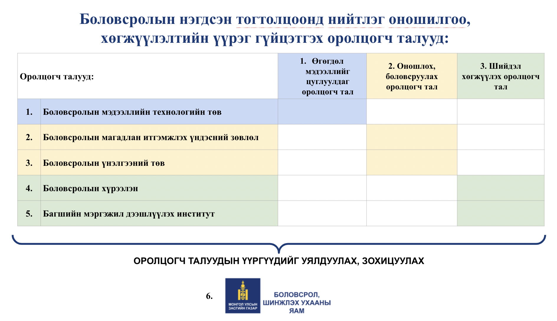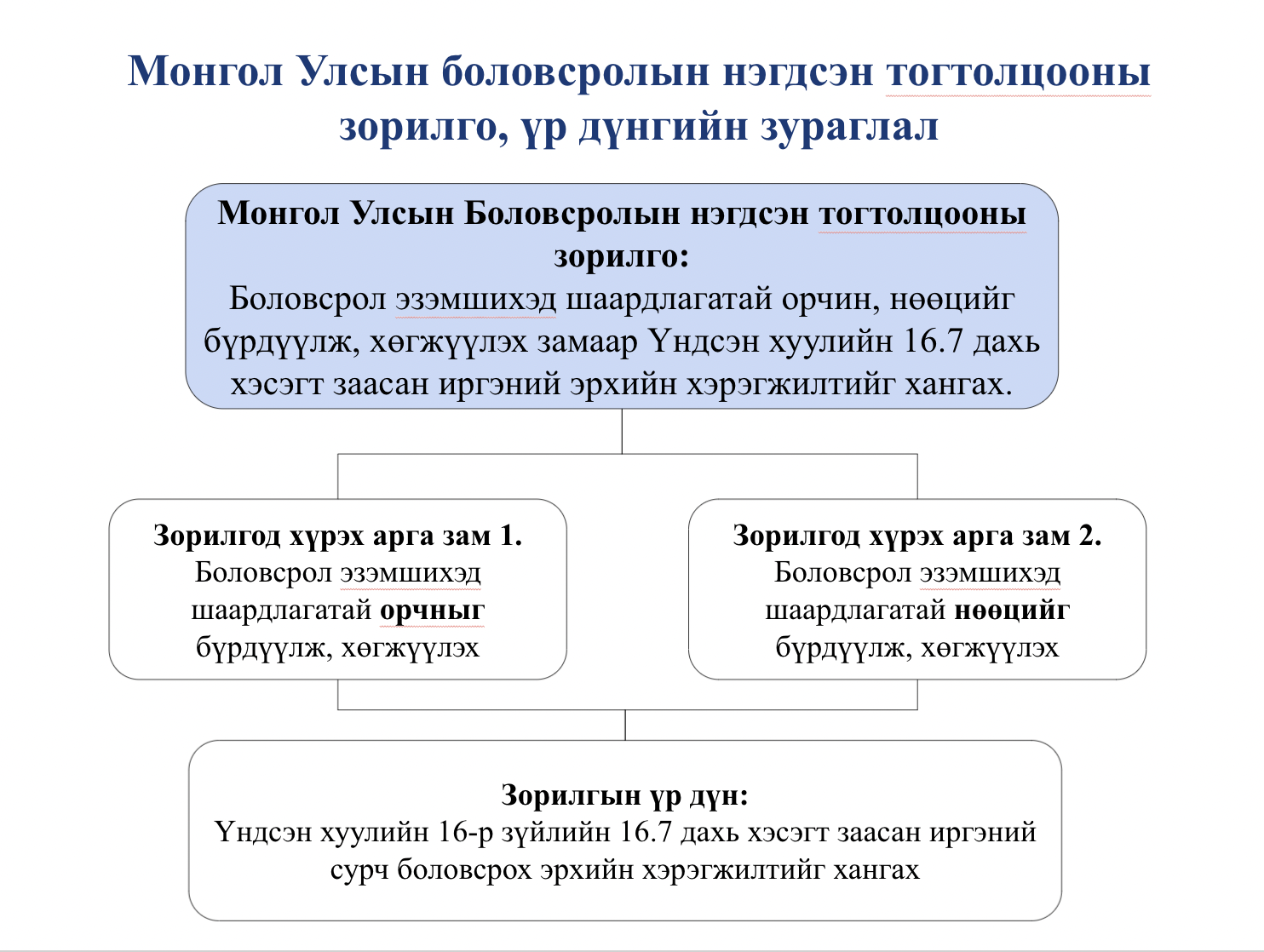 Боловсрол эзэмшихэд шаардлагатай орчин, нөөцийг бүрдүүлж, хөгжүүлэх замаар Үндсэн хуулийн 16.7 дахь хэсэгт заасан иргэний эрхийн хэрэгжилтийг хангах.