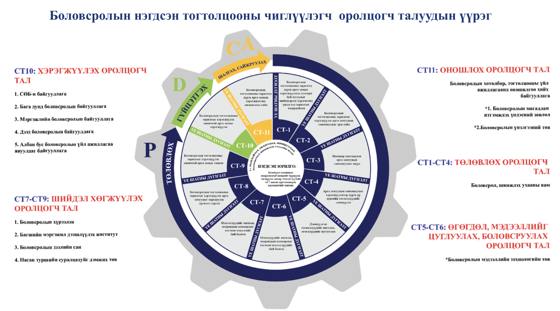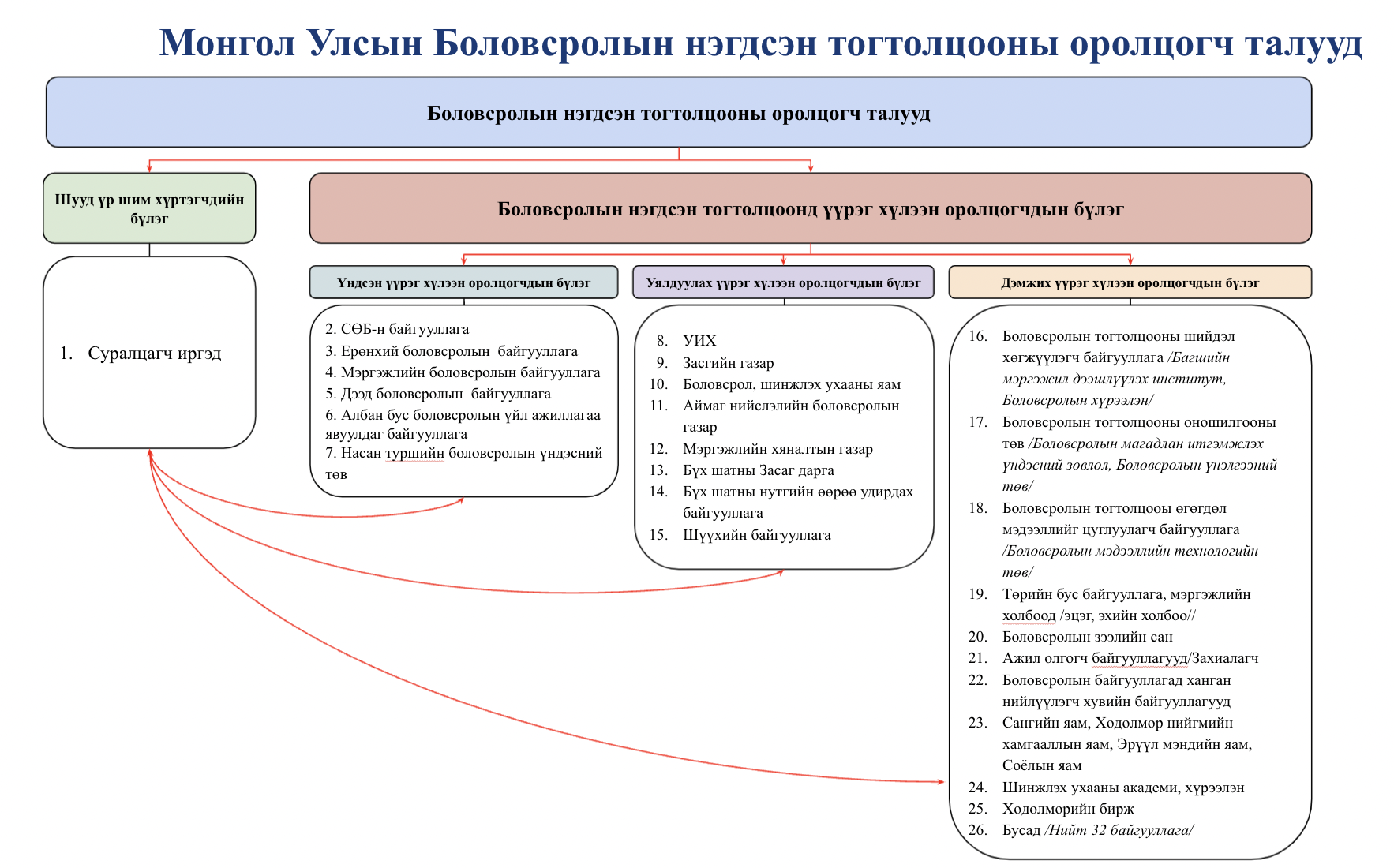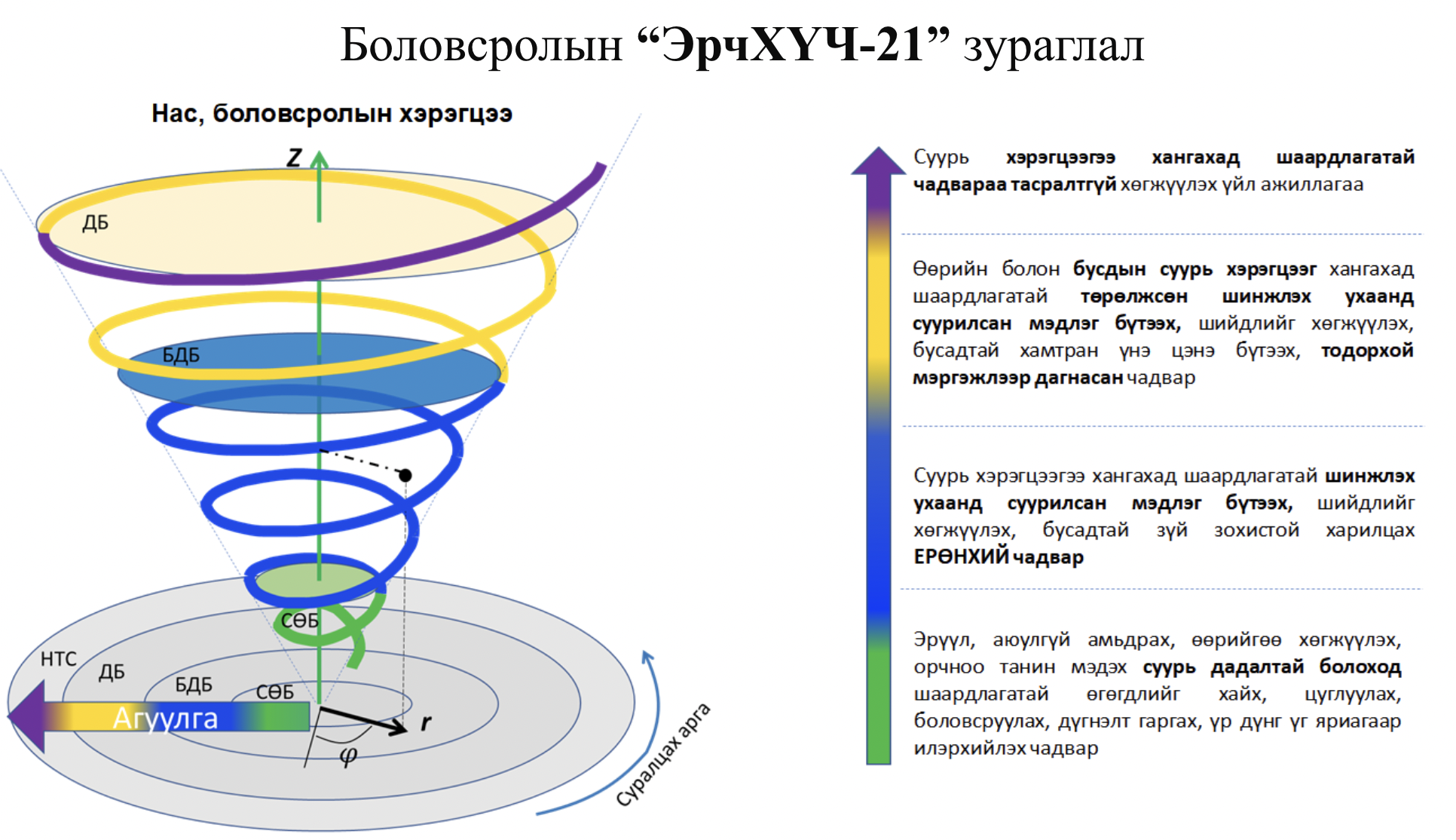 - Албан (сургуулийн өмнөх боловсрол, бага дунд боловсрол, дээд боловсрол) болон албан бус (насан туршийн) боловсролын зорилго нь хүнийг хөгжүүлэх үндсэн 21 чадварыг эзэмшүүлэхэд чиглэдэг.